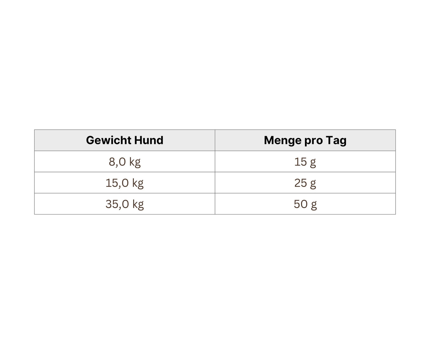 Tagesmenge in Gramm (Näherungswerte; abzustimmen auf individuelle Lebensumstände wie Auslauf, Rasse, Aktivität, Jahreszeit und Stoffwechsel).