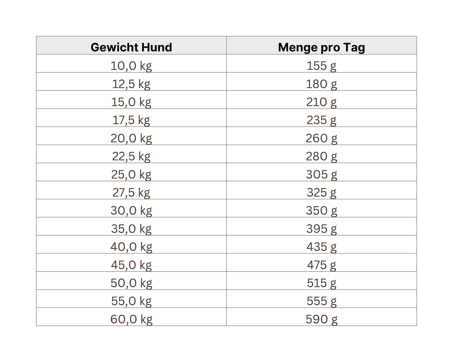Tagesmenge in Gramm (Näherungswerte; abzustimmen auf individuelle Lebensumstände wie Auslauf, Rasse, Aktivität, Jahreszeit und Stoffwechsel).