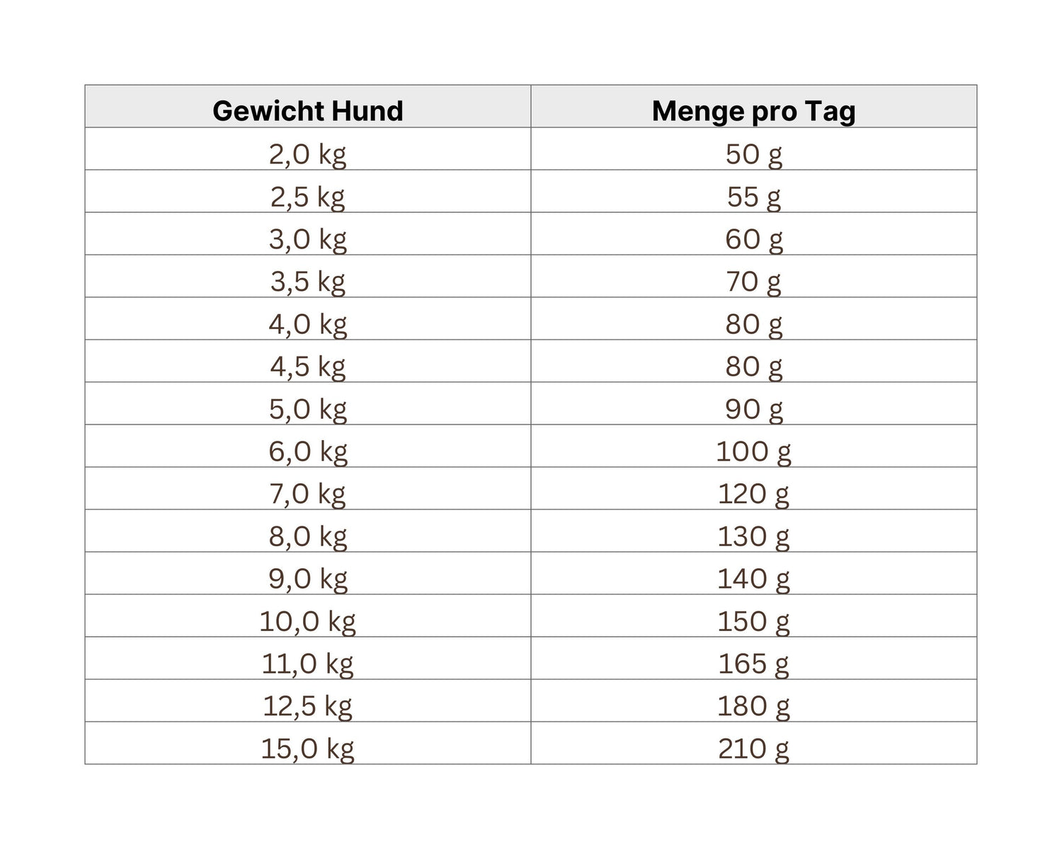 Tagesmenge in Gramm (Näherungswerte; abzustimmen auf individuelle Lebensumstände wie Auslauf, Rasse, Aktivität, Jahreszeit und Stoffwechsel).