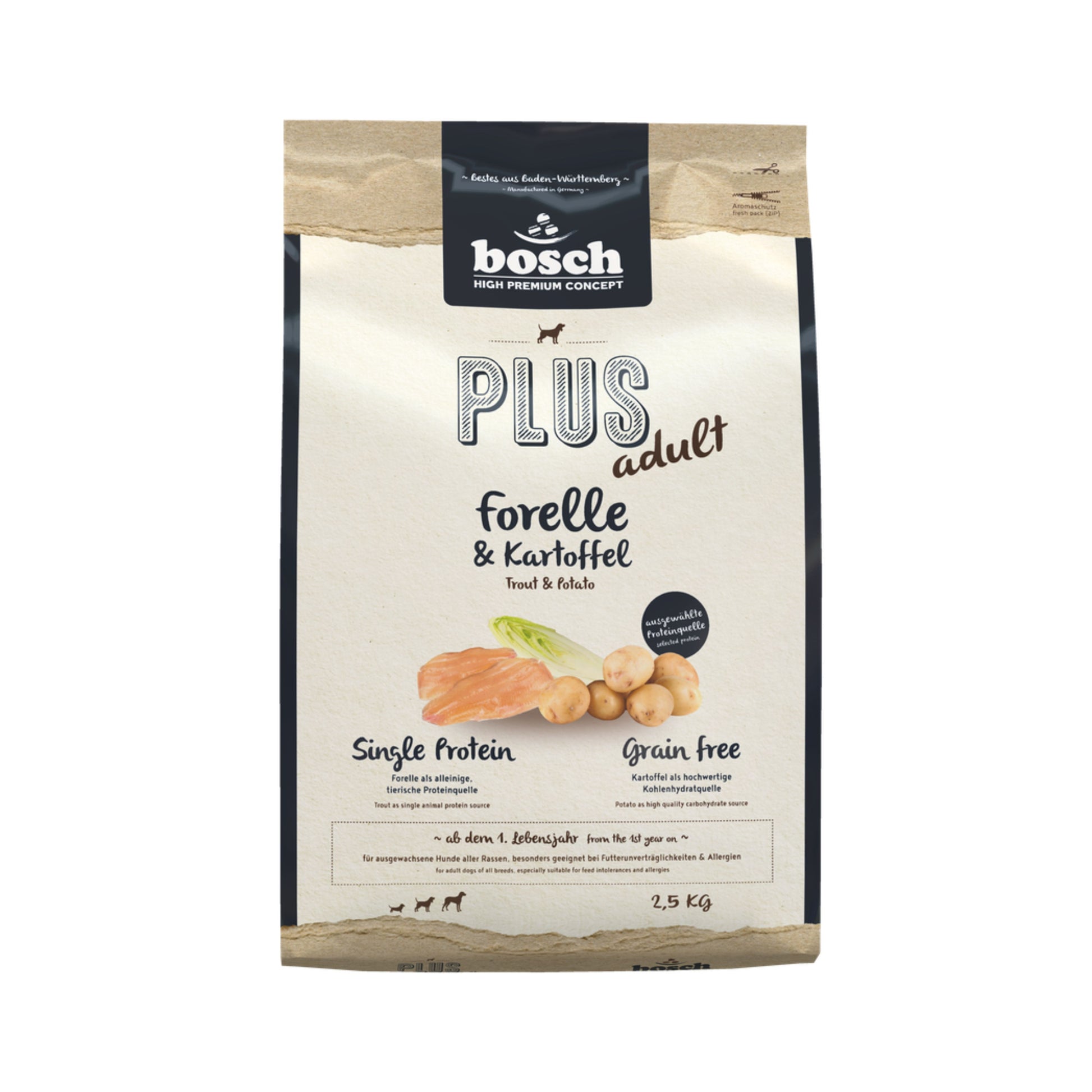 Unser PLUS Adult Forelle & Kartoffel ist ein ausgewogenes Alleinfuttermittel für ausgewachsene Hunde. Mit frischer Forelle (12,5 %) als einzige tierische Proteinquelle und leicht verdaulicher Kartoffel bietet es eine schonende, natürliche und getreidefreie Ernährung.
