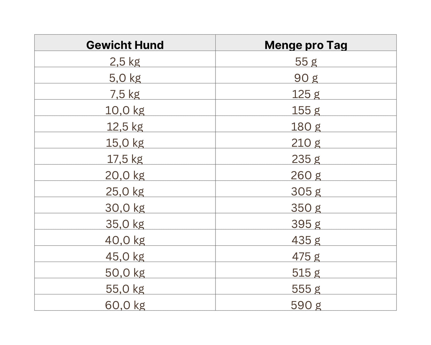 Tagesmenge in Gramm (Näherungswerte; abzustimmen auf individuelle Lebensumstände wie Auslauf, Rasse, Aktivität, Jahreszeit und Stoffwechsel).