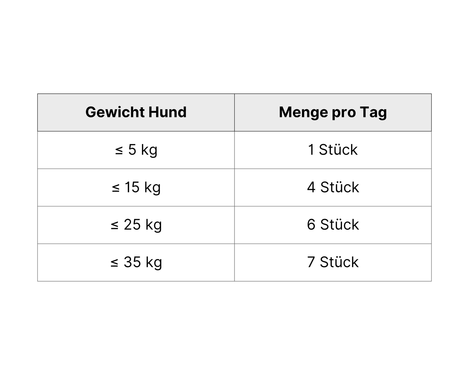 Tagesmenge in Gramm (Näherungswerte; abzustimmen auf individuelle Lebensumstände wie Auslauf, Rasse, Aktivität, Jahreszeit und Stoffwechsel).