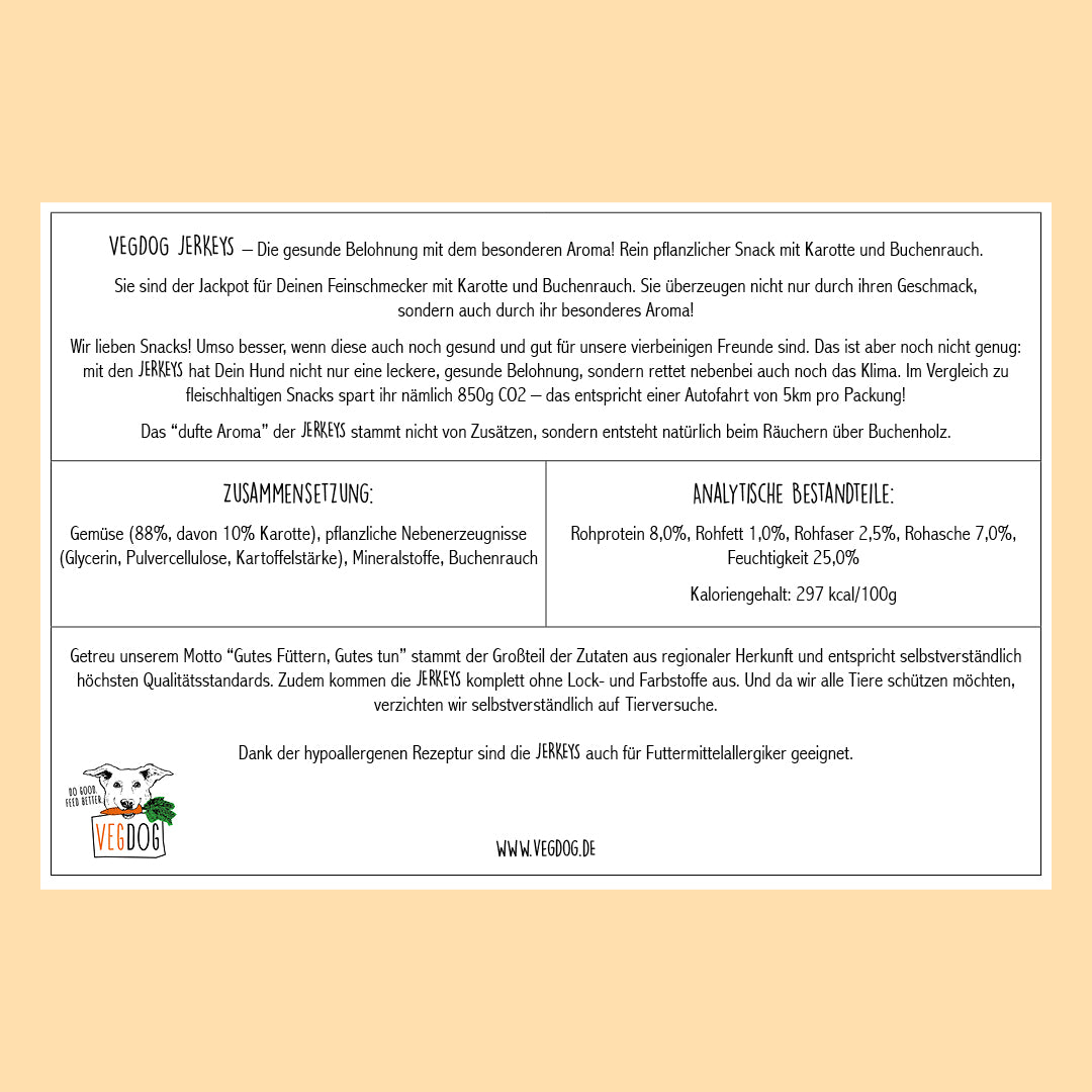 VEGDOG JERKEYS sind vegane Hundesnacks aus Karotten, schonend über Buchenholz geräuchert – ein unwiderstehlicher Snack, der deinen Hund glücklich macht und gleichzeitig gut tut.