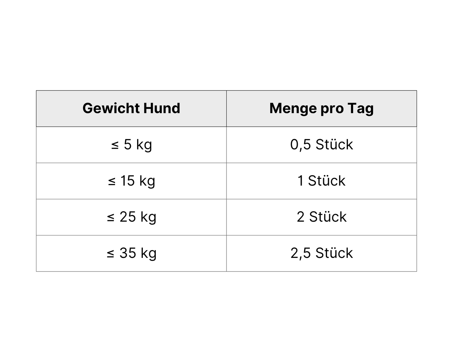 Tagesmenge in Gramm (Näherungswerte; abzustimmen auf individuelle Lebensumstände wie Auslauf, Rasse, Aktivität, Jahreszeit und Stoffwechsel).