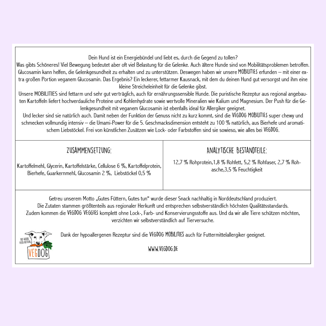 VEGDOG Mobilities sind vegane Hundesnacks mit extra Glucosamin – ideal, um die Gelenkgesundheit deines Hundes zu unterstützen. Egal ob Jungspund oder Senior: Die fettarmen Kausnacks fördern Beweglichkeit und sorgen für langanhaltenden Spaß beim Toben.