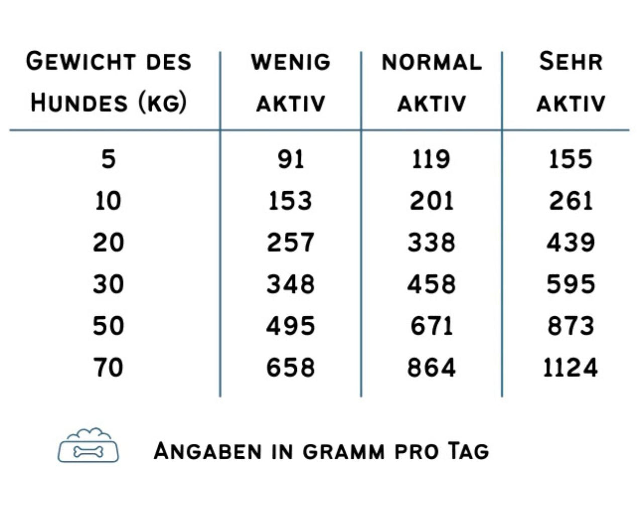 Die Fütterungsempfehlung richtet sich nach dem Gewicht des Hundes und gilt pro Tier und Tag.