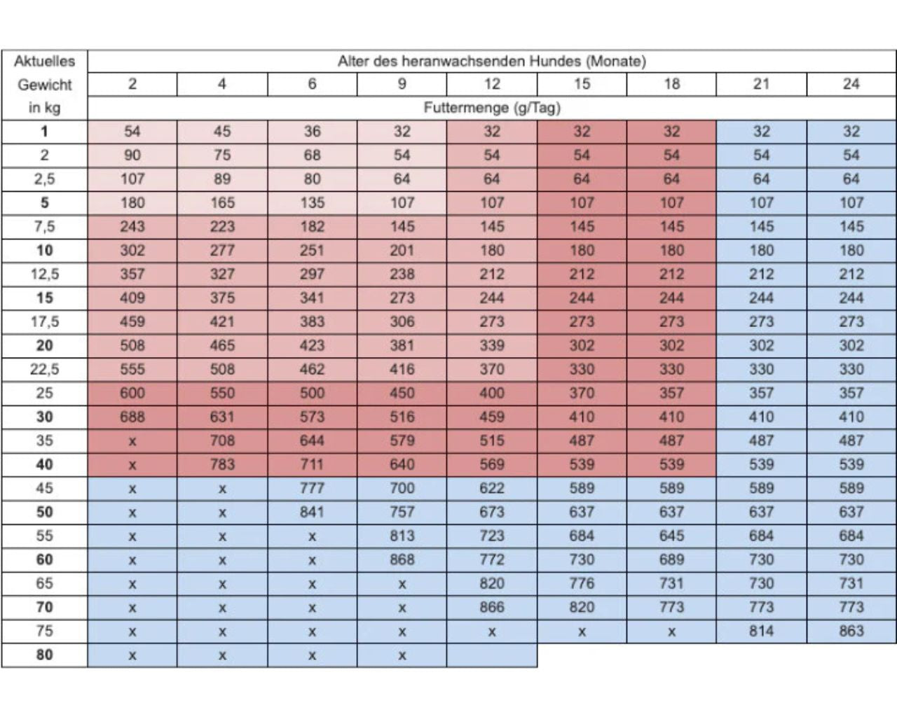 Die Fütterungsempfehlung richtet sich nach dem Gewicht des Hundes und gilt pro Tier und Tag.