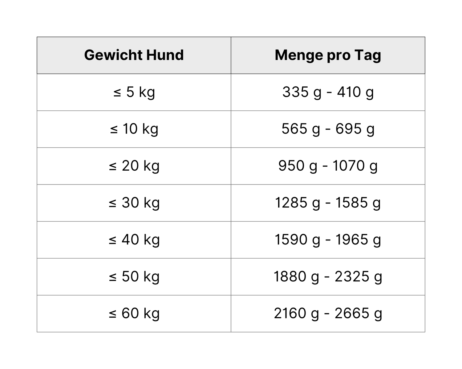 Tagesmenge in Gramm (Näherungswerte; abzustimmen auf individuelle Lebensumstände wie Auslauf, Rasse, Aktivität, Jahreszeit und Stoffwechsel).