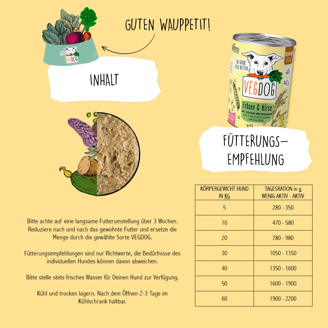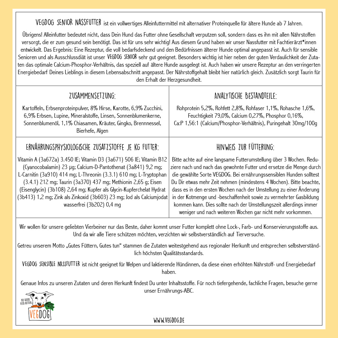 VEGDOG Senior Erbsen & Hirse ist ein vollwertiges, veganes Nassfutter speziell für ältere Hunde ab 7 Jahren. Es unterstützt ein gesundes Altern, fördert die Verdauung und sorgt dafür, dass dein treuer Begleiter auch im Senioren-Alter vital und aktiv bleibt.