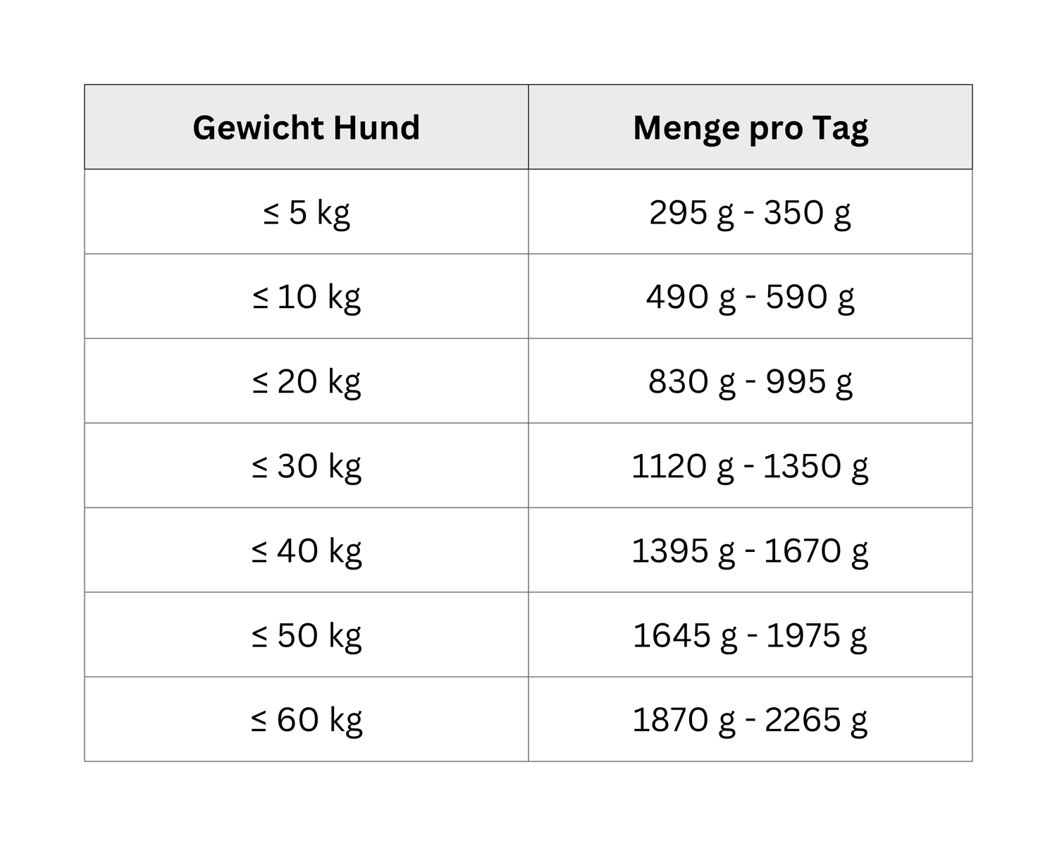 Tagesmenge in Gramm (Näherungswerte; abzustimmen auf individuelle Lebensumstände wie Auslauf, Rasse, Aktivität, Jahreszeit und Stoffwechsel).