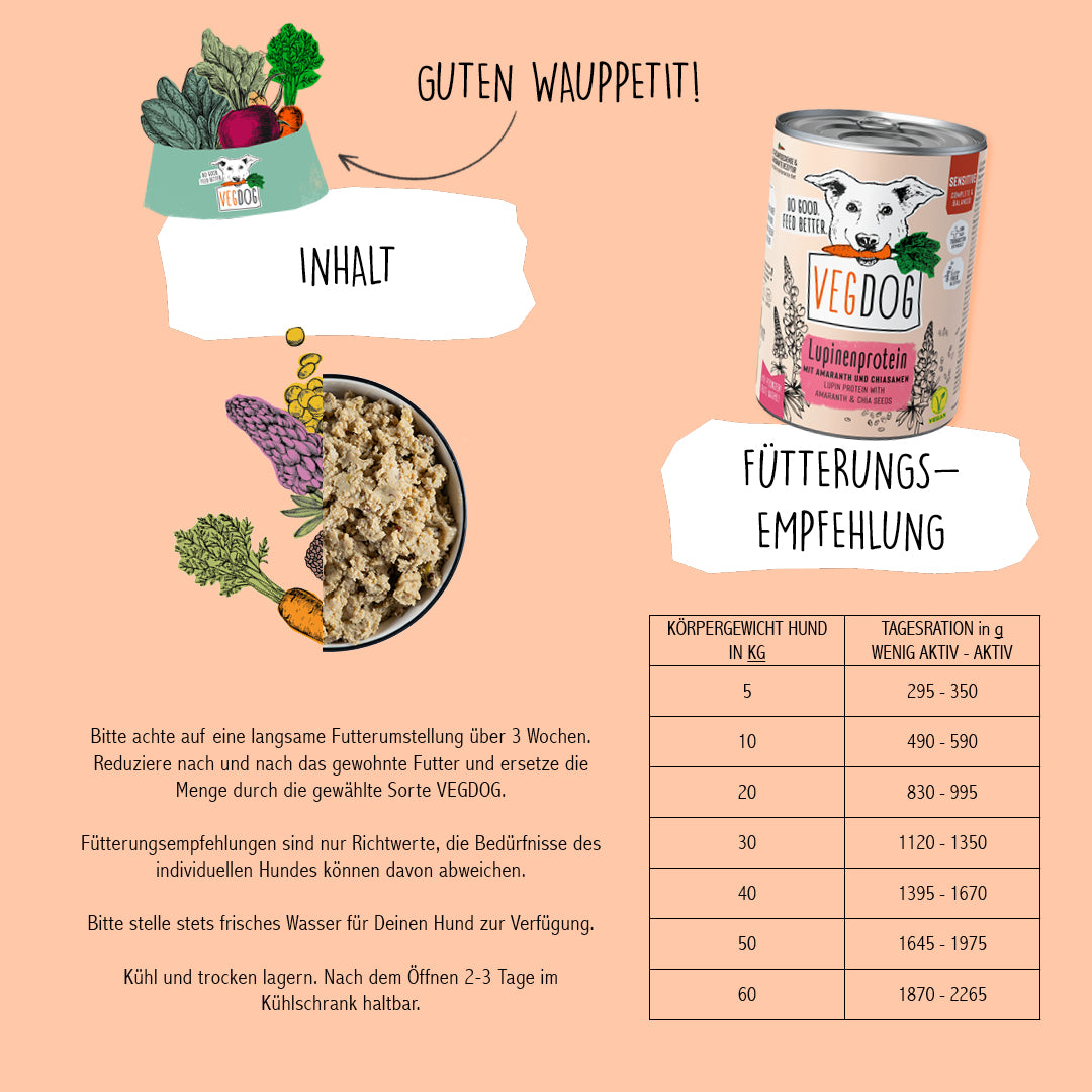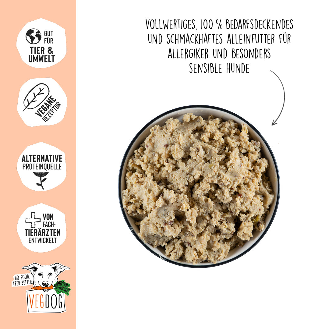 VEGDOG Sensitive Lupinenprotein wurde speziell für ernährungssensible Hunde konzipiert, die bestimmte Zutaten nicht vertragen. Die Rezeptur ist komplett gluten- und sojafrei – ideal bei Allergien, Verdauungsproblemen oder Hautirritationen.